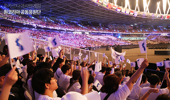 역사적인 남북 공동입장 순간, 개막식장에는 단일기가 나부꼈다. 경기장 저 멀리 단일기와 선수들이 입장하는 순간부터 응원단은 자리에서 일어나 ‘우리는 하나다’를 외쳤다. 선수들은 입장부터 퇴장까지 관중석을 바라보며 손 흔들어 주었고, 아시안게임 조직위원장도 평화의 상징으로 남북 공동입장을 강조했다.