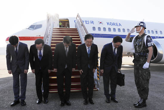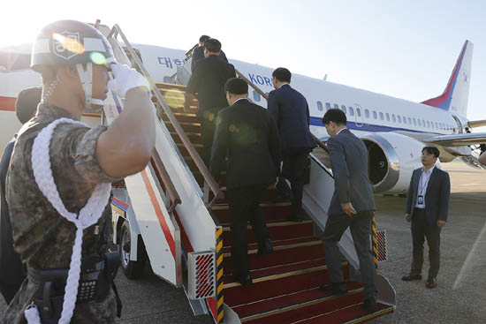 성남공항에는 조명균 통일부 장관과 남관표 국가안보실 2차장 등이 나와 배웅했고, 특사 대표단은 비행기에 오르기 전에 나란히 서서 허리굽혀 인사했다. 정의용 실장은 “잘 다녀오겠다”고만 인사했다.