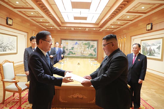 문재인 대통령의 특사인 정의용 청와대 국가안보실 실장 등 대북 특사대표단은 5일 노동당 본부청사에서 김정은 국무위원장을 면담하고 문 대통령의 친서를 전달했다.