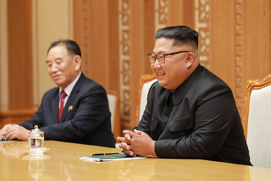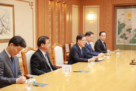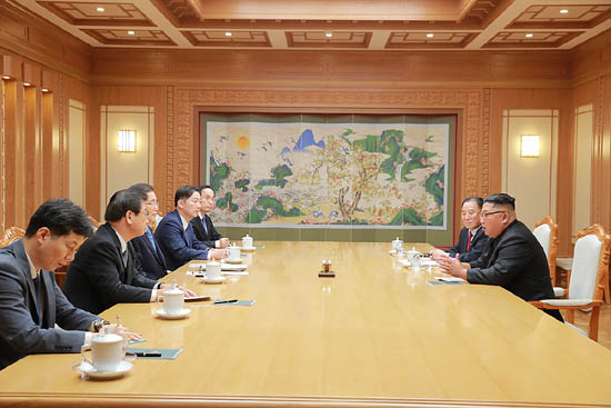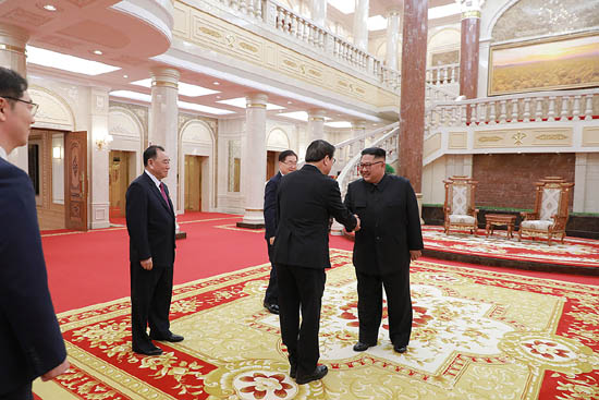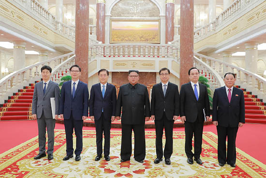 김정은 국무위원장인 특사인 정의용 실장을 비롯해 대표인 서훈 국가정보원 원장, 천해성 통일부 차관, 김상균 국가정보원 2차장, 윤건영 청와대 국정기획상황실장과 차례로 악수하고 기념촬영을 했다.