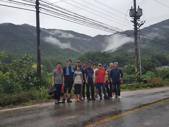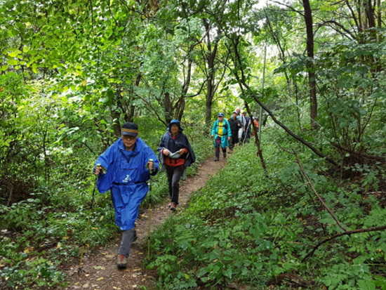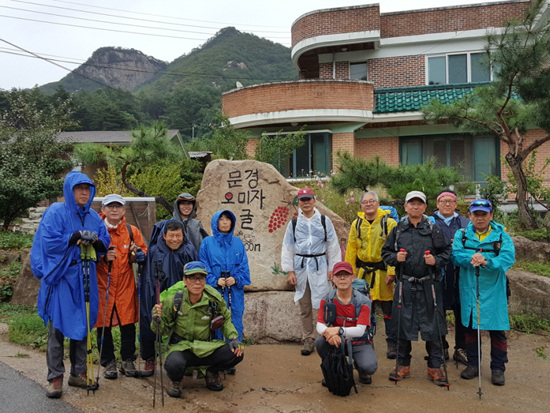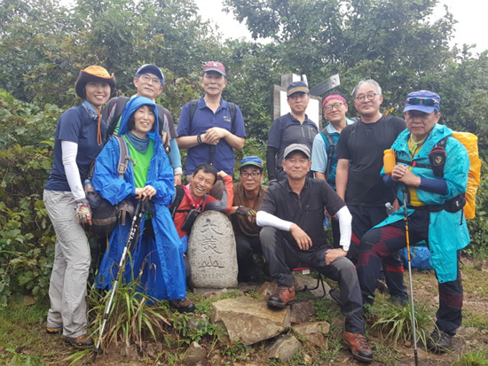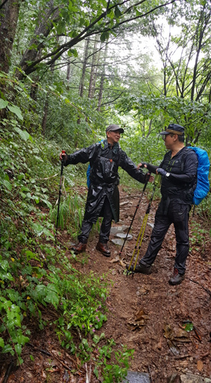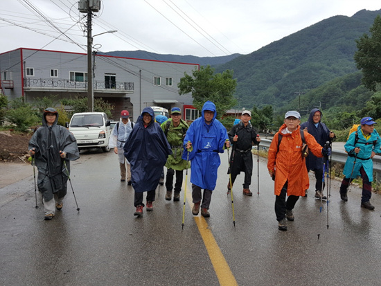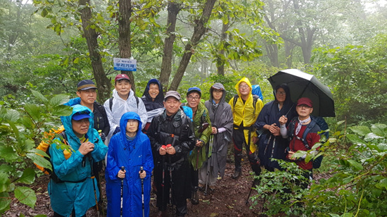 오락가락하던 빗줄기가 순간 소나기로 돌변하고 대원들은 색색의 우의를 입고 산행 길을 준비한다. 강남순 대원은 그 와중에도 어느 틈엔가 와인피플에 들러 대원들을 위해 오미자와인을 구입해 온다.