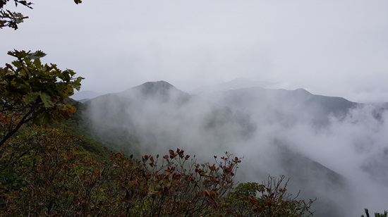 대미산 정상서 부리기재로 방향을 트니 잠시나마 조망이 터진 곳이 나타난다. 저 멀리 여우목 고개 너머 운달산줄기에 운무가 피어오른다.
