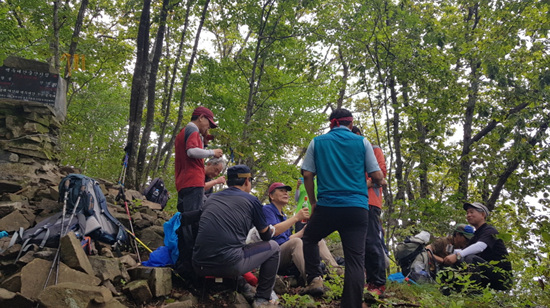 두 번째 표지석에서 모두들 강남순 대원이 선물한 오미자 와인을 한잔씩 마신다. 쌉쌀한 맛이 감칠맛이 있다. 산에서 마시면 그 무엇이 맛이 없겠냐만 이 고을에서 직접 재배한 것으로 만들었다니 느낌이 새롭다.