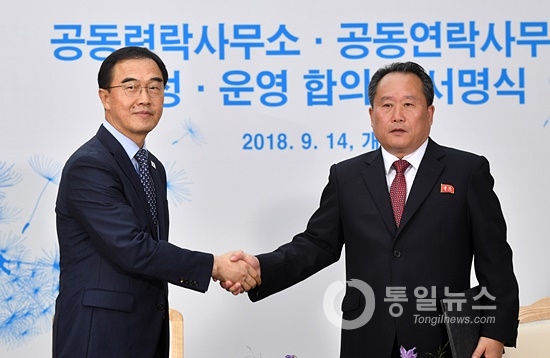 조명균 통일부 장관과 리선권 조국평화통일위원회(조평통) 위원장이 14일 ‘남북 공동연락사무소 구성.운영에 관한 합의서(이하 합의서)’에 서명했다.