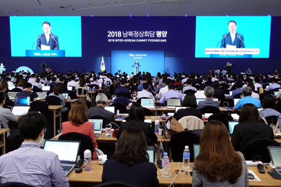 윤영찬 청와대 국민소통수석은 평양 정상회담 첫날인 18일, 대통령 전용기가 이륙한 직후인 오전 9시 4분께 동대문 디자인플라자(DDP)에 설치된 메인프레스센터 브리핑룸에서 이같이 예상했다. 메인프레스센터는 790여석이 마련됐고, 취재를 신청한 내외신 기자는 2,700여명이다.