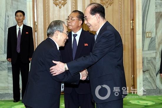 김영대 부위원장은 “문재인 대통령과 함께 평양을 방문한 데 대해 열렬히 환영한다”며 “잃어버린 10년을 뒤로 하고, 새로운 통일시대를 맞아 여러분들을 평양에서 만나 얘기도 나누고 하니 기쁜 마음을 금할 길이 없다”고 환영했다.