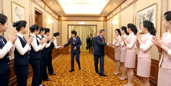 문재인 대통령 부부와 수행원들은 이날 아침 7시 27분께 평양국제비행장을 출발해 8시 20분께 삼지연공항에 도착했다. 특별수행원들은 고려항공 편으로 도착했다.