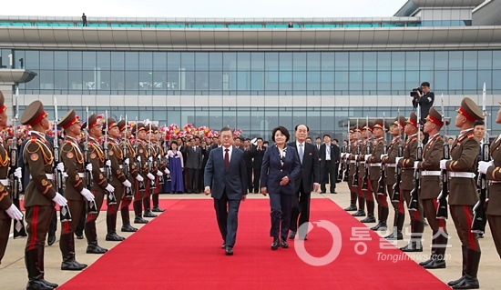 김정은 국무위원장 부부는 삼지연공항에 미리 도착해 문재인 대통령 부부를 영접했고 군악대와 의장대, 북녘 주민들이 간단한 환영식을 베풀었다.