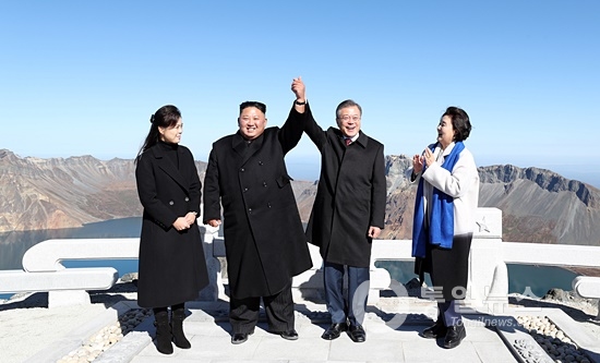 문재인 대통령과 김정은 국무위원장이 20일 오전 백두산 장군봉에 올랐다. 그리고 백두산 천지에 남쪽에서 가져온 한라산 백록담 물을 섞었다.