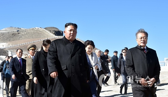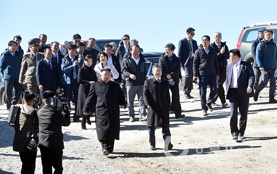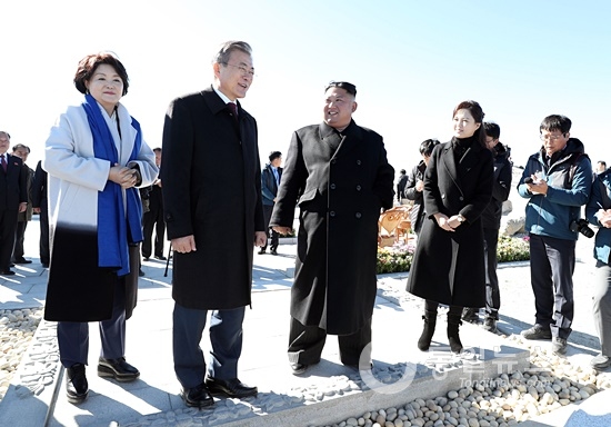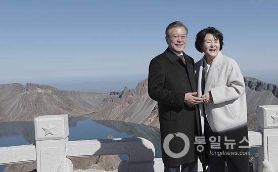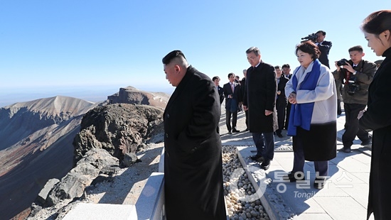 문 대통령 부부는 이날 오전 8시 20분경 삼지연비행장에 도착, 먼저 온 김 위원장 부부와 함께 차량으로 백두산 장군봉으로 향했다. 장군봉에서 내린 남북 정상은 백두산 천지를 부감했다.