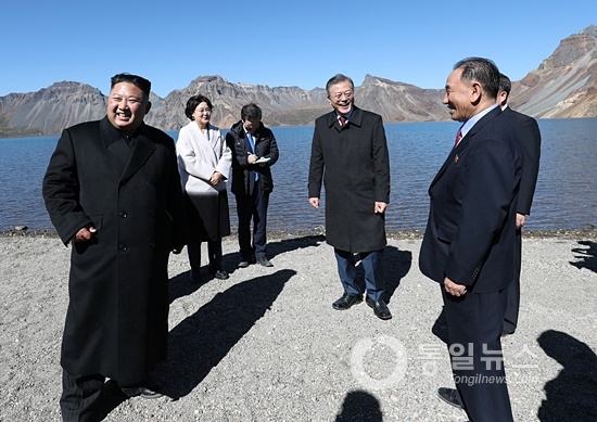 천지로 향하기에 앞서 김 위원장의 제안으로 남북 정상은 기념사진을 찍었다. 이를 본 북측 김영철 당 부위원장은 “통일강국을 일으켜 세울 결심을 표현한 것”이라며 “통일강국을 일떠세울 영예를 본받아 백두신령이 내리는 광경을 바라볼 수 있다”고 말했다.