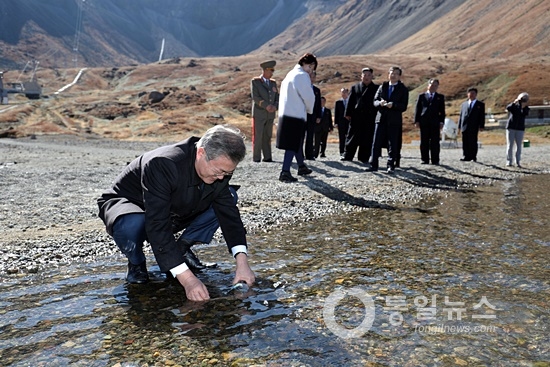 백두산 장군봉에서 한반도의 미래를 그린 남북 정상은 천지로 향했다. 김 위원장이 천지로 내려가자고 제안하자, 문 대통령은 “천지가 나무라지만 않는다면 손이라도 담궈보고 싶다”고 미소를 지었다.