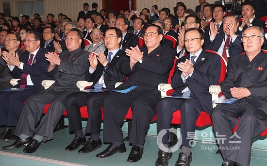 약 1시간가량 과학기술전당을 둘러본 방북단은 오후 4시 15분 평양대극장으로 이동했다. 지난 9월 남북정상회담의 공연과 같은 내용으로 진행됐다.