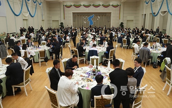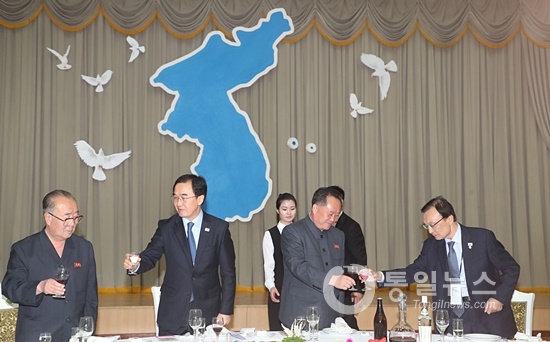 이어 “이제 분단과 대립의 시기를 끝내고 평화와 번영으로 넘어가는 선긋기에 모든 분들이 함께해준다는 것에 감사하다”며 “이 잔이 선이 돼서 선이 한바퀴 돌면 통일이 완전히 되는 것”이라며 “평화통일을 위하여”라고 외쳤다.