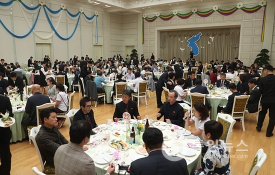 10.4선언 11주년 민족통일대회 방북단을 위한 북측 주최 환영만찬이 4일 오후 7시경 평양 인민문화궁전에서 열렸다.