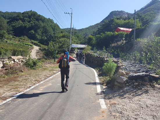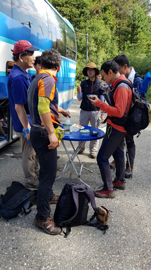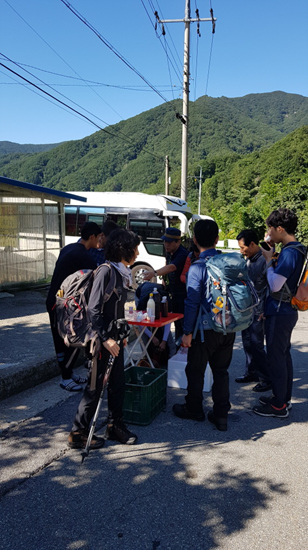 버스에서 내리니 마을 청년이 오미자차를 한잔씩 권하면서 오미자차와 와인을 팔고 있다. 새콤 달달한 오미자차를 한잔 얻어 마시고 김태현 선배님은 오미자와인 두 병을 구입해 배낭에 챙겨 넣는다.