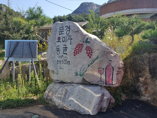 마을길을 따라 조금 올라 오미자 와인동굴 카페 앞에서 출발에 앞서 단체 사진을 찍기 위해 서 있는데 옆 계곡에서는 물소리가 시원하게 들린다.