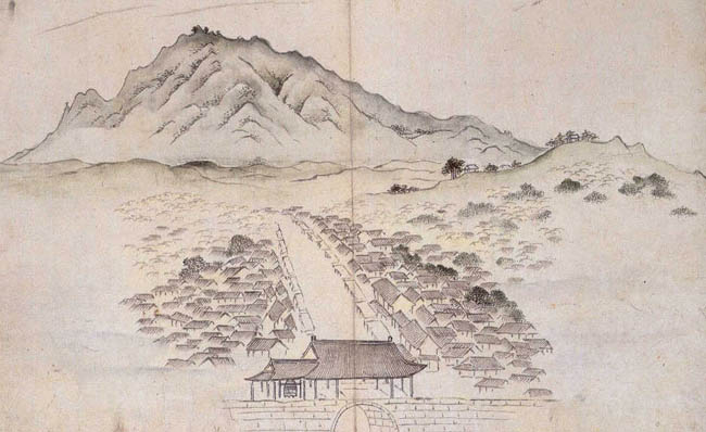 앞쪽의 성은 정면에서 본 시점이다. 그렇다면 큰 길을 중심으로 양 옆으로 집들이 있는 모습은 성루 위에 올라가서 본 것이다. 길 앞쪽에서 뒤로 가면서 좁아지는 것은 원근법을 적용했다. 하지만 소실점이 명쾌하지 않다.