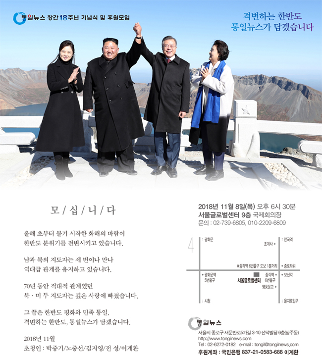 곽태환 2018-11-06 16:30:16 더보기 삭제하기 통일뉴스 창간 18주년을 기념하여 진심으로 축하드립니다. 어려운 여건속에서 이계환 대표를 위시하여 통일뉴스 가족여러분들이 강건하게 조국의 평화 통일을 위하여 힘차게 노력해주신덕분에 우리가 좋은글을 매일 읽게 되어 기쁘고 깊히 감사드립니다. 앞으로도 정의롭게 공정한 기사를 읽을수 있도록 혼신의 힘을 다해 노력해 주시길 당부 드립니다. 참으로 감사드립니다.God Bless Tongilnews!