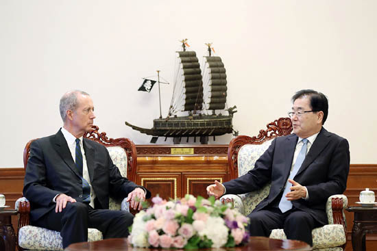 청와대는 “정 실장과 맥 손베리 위원장은 오늘 면담에서 한반도 비핵화와 평화정착 방안에 대해 심도 깊은 논의를 하였으며, 정 실장은 미 의회의 협조를 당부했다”고 전했다.