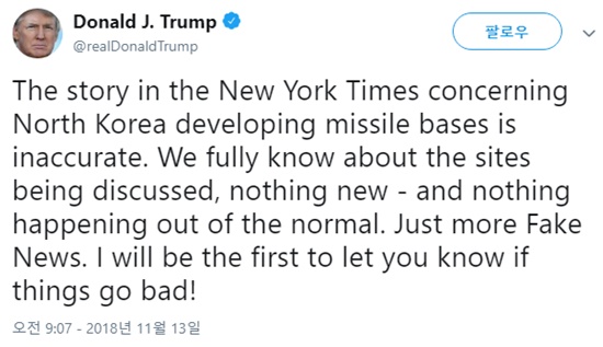 이날 트윗을 통해, 트럼프 대통령은 “북한의 미사일 기지 개발에 관한 뉴욕타임스 기사는 부정확하다”면서 “우리는 토론되는 그 기지에 대해 완전히 알고 있고, 새로운 것도 없으며 정상적이지 않은 일은 일어나지 않았다”고 일축했다.