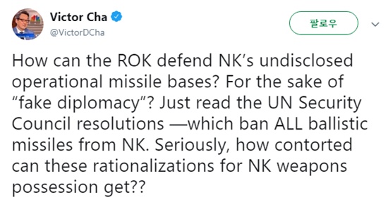 14일 트윗을 통해, 그는 “한국이 어떻게 북한의 비공개 미사일 기지를 변호(defend)할 수 있느냐?”며 “‘가짜 외교(fake diplomacy)’를 위해서?”라고 되물었다. 이어 “유엔 안보리 결의를 읽어보라 북한의 모든 탄도미사일을 금지하고 있다”면서 “정말로 어떻게 북한의 무기 보유를 합리화할 수 있느냐”고 강변했다.