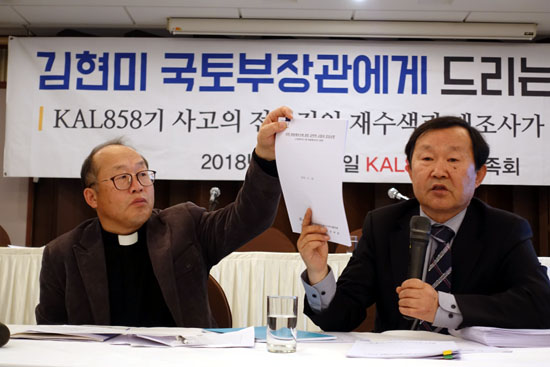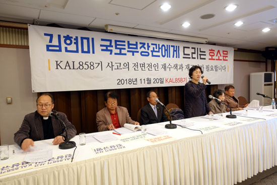 ‘KAL858기 가족회’와 ‘KAL858기 사건 진상규명 대책본부’는 20일 오전 11시 서울 프레스센터 19층 매화홀에서 ‘KAL858기 사건 진상규명을 위한 긴급기자회견’을 갖고 김현미 국토부 장관에게 재조사를 촉구했다.