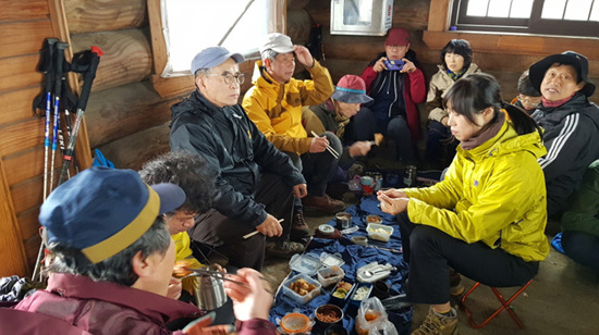 먼저 식사를 하는 등산객 옆으로 자리를 잡고앉아 급하게 밥을 먹는다.
