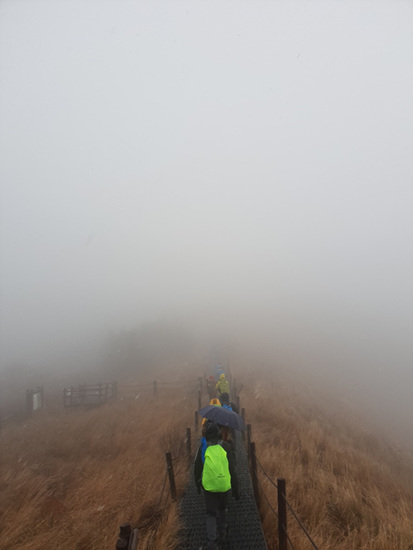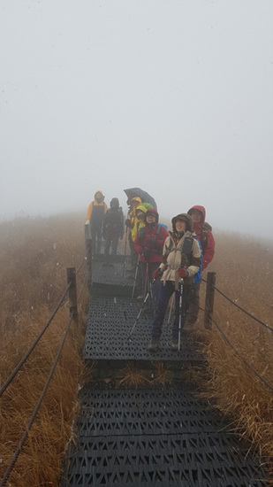 고원에서 내리던 눈이 하산 길에는 비로 바뀐다.