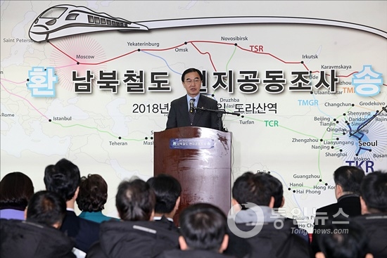 조명균 통일부 장관은 “오랜 준비 기간을 거쳐 오늘 드디어 경의선.동해선 철도 현지 공동조사가 시작된다”며 “정부는 앞으로 남북 두 정상이 합의하신 착공식도 올해, 연내에 개최할 수 있도록 착실하게 준비해 나갈 것”이라고 말했다.