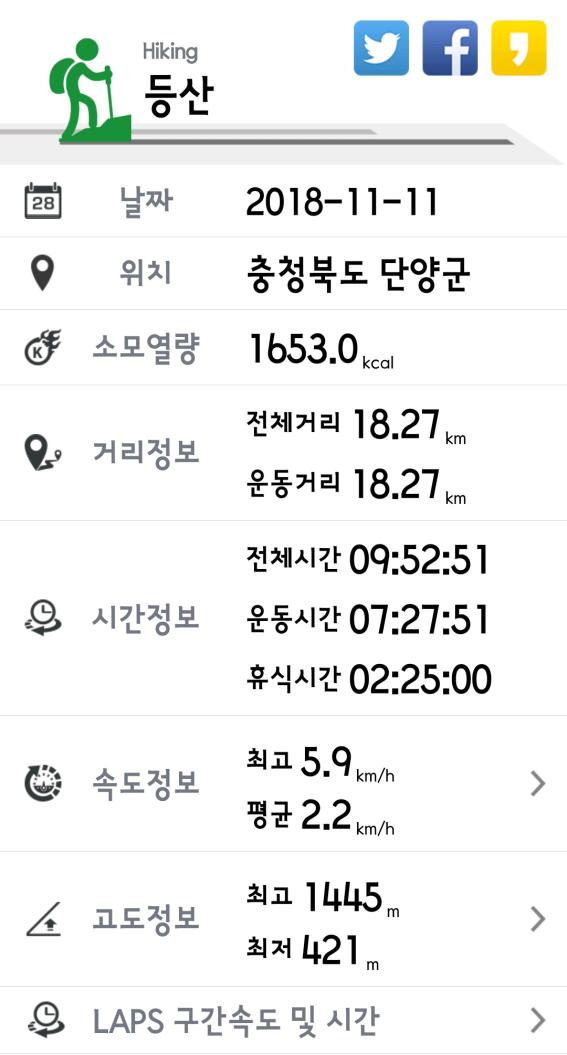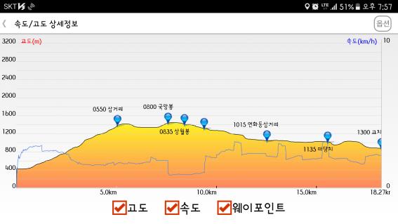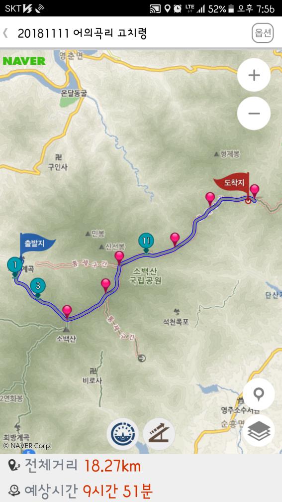 | 일시 : 2018년 11월 9~10일(무박) 구간 : 어의곡리~어의곡삼거리~국망봉~상월봉~늦은맥이~고치령~좌석리 거리 : 18.27Km(접속구간 4.7km 포함) 시간 : 9시간 53분(휴식시간 포함) 인원 : 9명 |