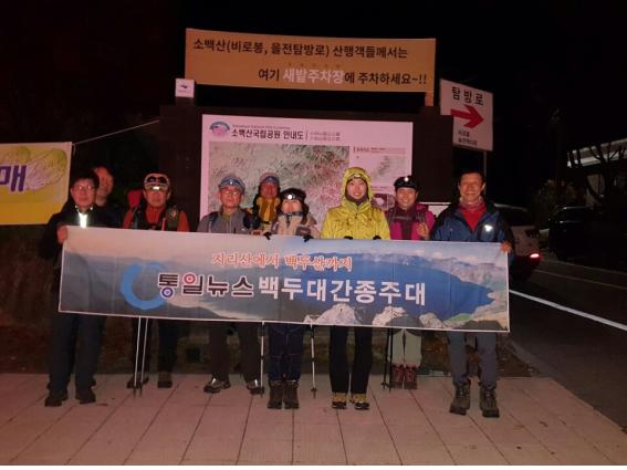 예정대로 11시 30분 사당역을 떠난 전용버스는 휴게소에 잠시 들른 후 새벽 3시에 36구간 종착지였던 어의곡리 새밭주차장에 우리를 내려준다. 전속으로 예약한 25인승 차량은 비교적 새것인데다 좌석도 편안한 것으로 개조했고, 뜨거운 물과 커피도 먹을 수 있도록 준비되어 있으며 기사님과도 정이 들어 한층 안정감을 준다. 가끔 불가피한 상황에서는 다른 차량으로 대체되기도 하는데 이보다 편한 적이 한 번도 없었다.
