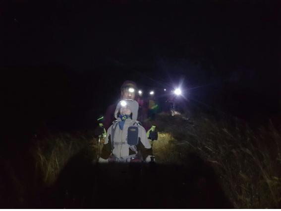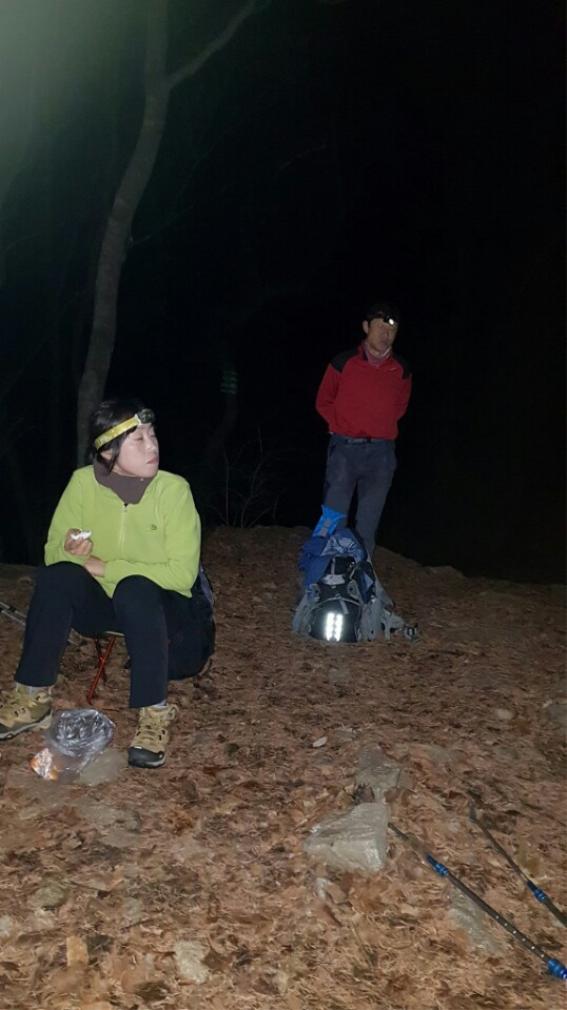 다소 쌀쌀한 날씨에 두툼한 옷을 입고 출발하였지만 1Km도 못가서 옷을 벗어야만 할 정도로 바람도 없고 계속되는 오르막길이다. 봄과 여름의 새소리, 가을의 풀벌레 울음소리는 겨울의 찬바람에 밀려나고, 계곡의 물소리, 스틱이 돌에 부딪치는 소리, 무거운 등산화 끌리는 소리만이 밤하늘에 퍼질 뿐 한줄기 헤드랜턴 불빛 속을 걷는 대원들은 말이 없다.