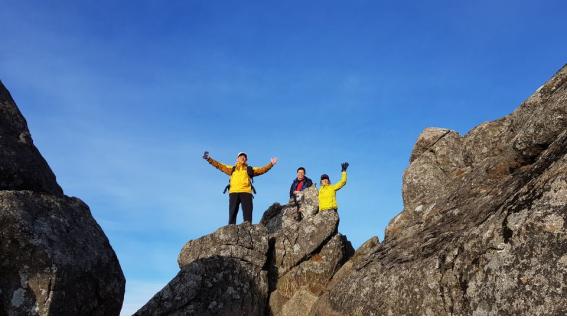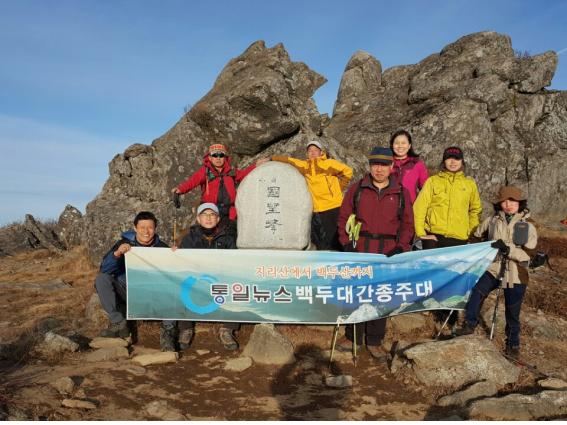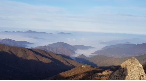 졸음과 배고픔을 참아가며 이번 산행에서 가장 높은 국망봉(1,420m)에 도착하니 없던 힘이 생긴다. 표지석 뒤에 서있는 바위에 올라가 단양과 영주지역의 경치를 둘러본다. 서울에서 미세먼지가 나쁘다는 일기예보를 보고 왔는데 저 멀리 속세는 구름 속에 갇혀있고, 여기 하늘은 더없이 높고 파랗다. 소백산에 있는 우리들은 바로 구름위에서 놀고 있는 신선들이란 생각이 들었다.