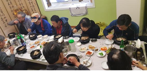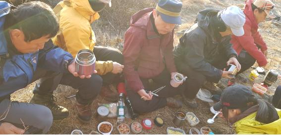 이제는 대부분 보온병에 밥과 국을 담아온다. 오늘 아침은 그리 춥지 않고 시간상으로도 조금 빨리 온 편이라 느긋하게 식사를 먹을 수 있었다. 식구가 단촐해 옹기종기 둘러앉아 함께 즐기며 먹었다.