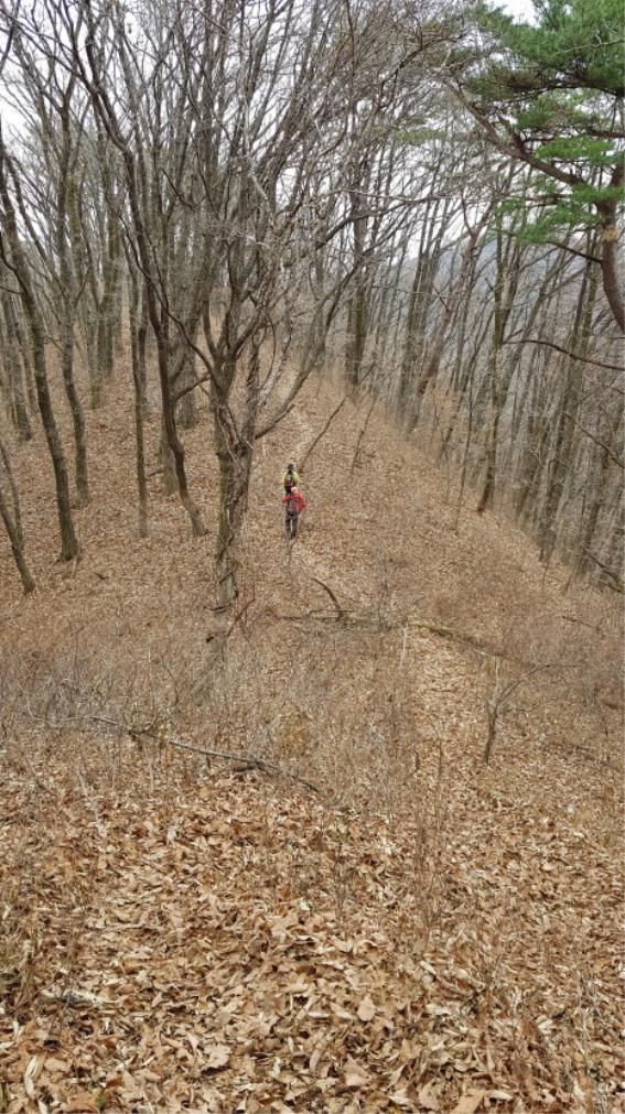 이제 배도 부르겠다, 오르막길도 별로 없겠다, 시간도 넉넉하겠다 싶어 여유 있게 하산한다. 신선봉까지 이어지는 하늘능선은 멋진 경치를 파노라마로 펼쳐놓고 있다. 마당치까지 내려가는 길에는 봄이면 환장할 정도로 사람들을 현혹시킬 철쭉동산이 길게 이어진다. 줄기가 하얗게 얼룩을 만들어낸 물푸레나무도 군락을 이루고 있었다. 이어지는 하산길은 참나무 낙엽이 수북이 쌓여 발이 푹푹 빠진다.