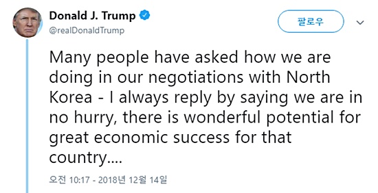 그는 이날 트윗을 통해 “많은 사람들이 북한과의 협상에서 우리가 어떻게 하고 있는지 물어본다”면서 이같이 답했다. 또 “그 나라에는 큰 경제적 성공을 위한 놀라운 잠재력이 있다고 (말한다)”고 덧붙였다.