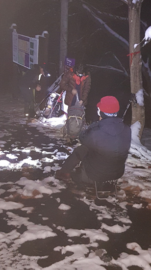 야간, 눈산행 슬슬 걱정이 되기 시작한다. 불안감을 애써 누르며 차에 오른다.