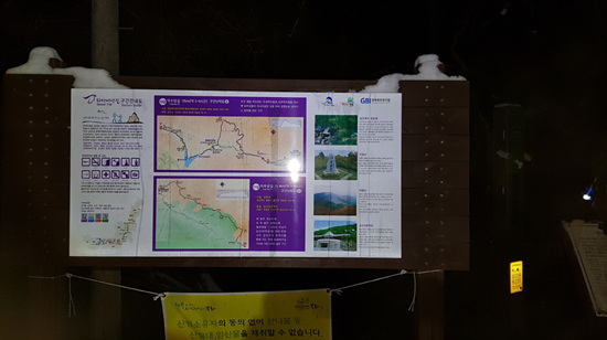 잠깐의 휴식을 끝내고 아이젠을 차고, 늦은목이를 향해 출발이다. 산으로 접어들자 갑자기 산불예방을 위한 안내방송이 나온다. 누가 우릴 엿보고 있었나? 차단 장비 감시를 받으며 눈 덮인 산길을 걸어 올라간다. 늦은목이 옹달샘을 지나고 조금 걸어 오르니 늦은목이재다. 늦은목이는 소백산 끝이고 오늘 대간길의 시작지점이다.