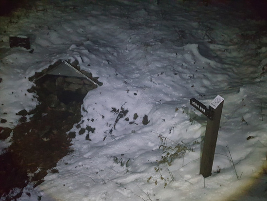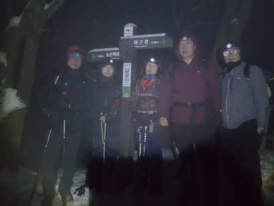 늦은목이에서 1킬로 정도 오르니 966미터 갈곶산이다. 랜턴 불빛에 눈이 반짝인다. 눈 헤치며 걷는 오르막은 에너지 소비가 심하다. 아침을 먹을 마구령까지는 4.9킬로 3시간은 가야한다. 잠깐의 휴식에도 체온이 떨어지는 것이 느껴진다. 행동식으로 에너지를 보충하고 걷는다.