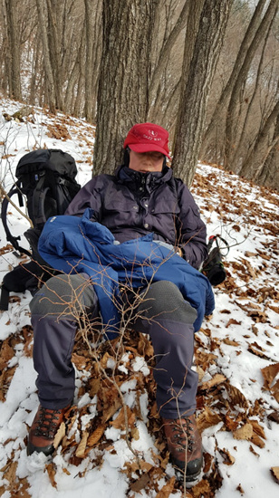 얼마를 걸었을까? 이계환 대원이 졸음을 참을 수 없다며 5분간만 자고 가잔다. 휴식은 그자체가 또 다른 고통인데. 손발이 시리고 아려서다. 사방이 눈인데 어디서 눈을 붙인단 말인가? 뒤돌아보니 벌써 의자를 깔고 나무 등걸에 기대 눈을 감는다. 손발이 얼지 않을까 조금 걱정이 된다. 이지련 단장만 남기고 간다.