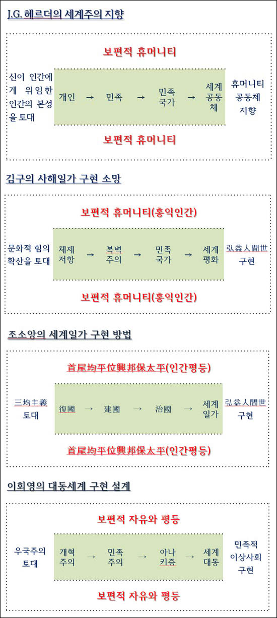 그는 헤르더의 세계주의와 김구의 사해일가의 꿈, 조소앙의 삼균주의, 이회영의 대동세계 등을 도표로 제시하며 “세계가 하나될 수 있는 끈이 뭐냐, 지고지선의 인류애라는 것을 알 수 있다”고 결론지었다.