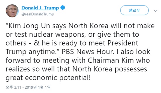 트럼프 대통령은 이날 트윗에서 PBS 보도를 인용해 “김정은이 북한은 더 이상 핵무기를 만들지도 실험하지도 다른 사람들에게 주지 않을 것이라고 말했다. 그는 언제든 트럼프 대통령과 만날 준비가 되어 있다(고 말했다)”면서 “나 또한 김 위원장과의 만남을 고대하고 있다 (그는) 북한이 큰 경제적 잠재력을 갖고 있다는 걸 잘 알고 있다!”고 밝혔다.