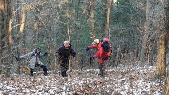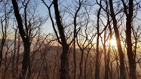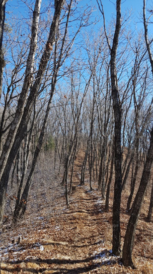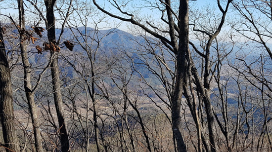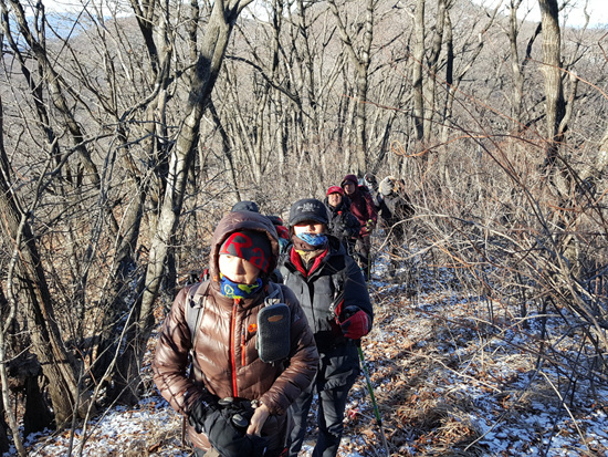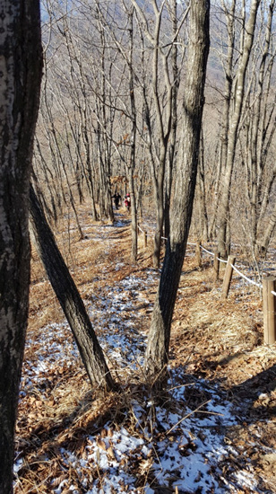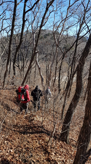 오르는 길은 능선 아래 산허리를 타고 이어진다. 보이는 것은 헐벗은 나무들과 수북이 쌓인 낙엽들뿐. 고개 들어 쳐다보면 긴 오르막이 기를 질리게 하고 이곳만 지나면 능선에 오를까 하면 또 다른 오르막이 앞에 떡하니 펼쳐진다.