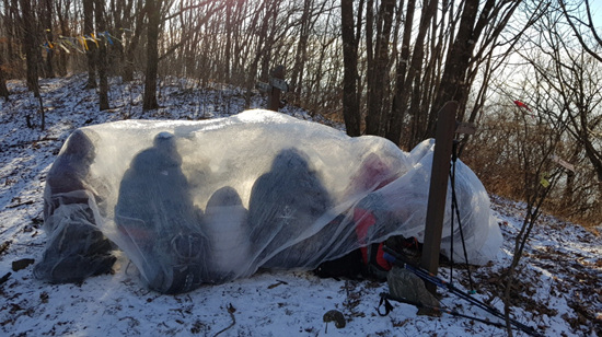 해가 뜨고 얼었던 세포가 하나둘 살아나면서 어김없이 허기가 찾아온다. 양지바르고 바람 없는 곳으로 가야 한다. 비닐텐트를 치는 것도 예삿일이 아니다. 바람이 여전히 세차 한 쪽을 끌어당기면 반대쪽이 들쳐지기를 반복한다. 한동안 씨름을 한 끝에 간신히 자리를 잡았다. 작년 부항령에서도 비닐텐트에서 아침 식사를 하였었다. 누군가 사진을 보곤 거지들 같다고 했다던데 밖에서 보니 영락없다.