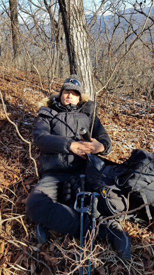 가파른 경사를 오르고 바위언덕 경사면에서 잠시 쉰다. 배낭 속의 물은 모두 얼어있다. 설마 했다. 두터운 겨울잠바와 모자, 장갑을 착용하여 추위로 덜덜 떨지는 않았지만 가져간 물이 얼어있을 줄은 생각지도 못했다.