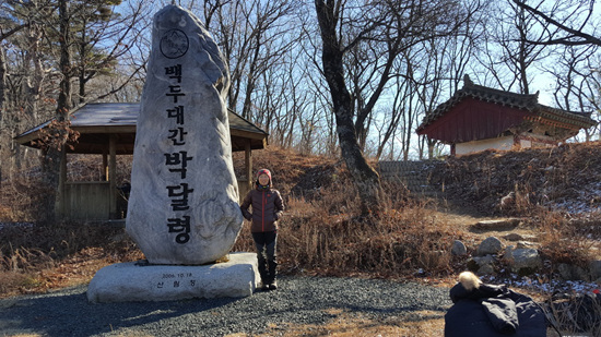 오르내림을 반복하면서 내려서는 긴 하산 길에 맥이 다 풀렸다. 그 옛날 길손들이 오고가며 무사를 기원했을 성황당이 보이고 커다란 표지석이 세워져 있는 박달령에 내려서니 마치 하산한 느낌이다. 그래서인가 이쯤에서 하산하자는 돌출발언이 나왔다.