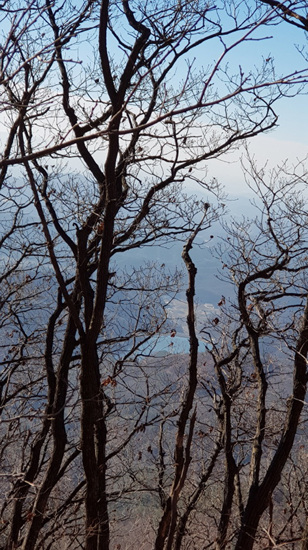 능선 남쪽 나뭇가지 사이로 물야 저수지가 서서히 눈에 들어오기 시작한다.
