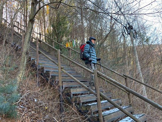 지난번에 지나친 곳이기도 하여 쉼 없이 오른다. 엄청 추운 새벽인데도 땀이 난다. 임도를 지나 상운사 입구에서 산불예방 방송을 들으며 숲길로 접어들었다. 벌써부터 손끝이 시려온다. 핫팩 생각이 간절하고 스틱은 사용하지 못한 채 장갑을 벗어서 옷 속으로 손을 넣어 녹여보기도 하지만 임시방편일 뿐이다.
