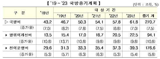 구체적으로 2019년 국방비 46조 7천억 원, 2020년 국방비 50조 3천억 원, 2021년 국방비 54조 1천억 원, 2022년 국방비 57조 8천억 원, 2023년 국방비 61억 8천만 원으로 점점 늘려간다는 것.